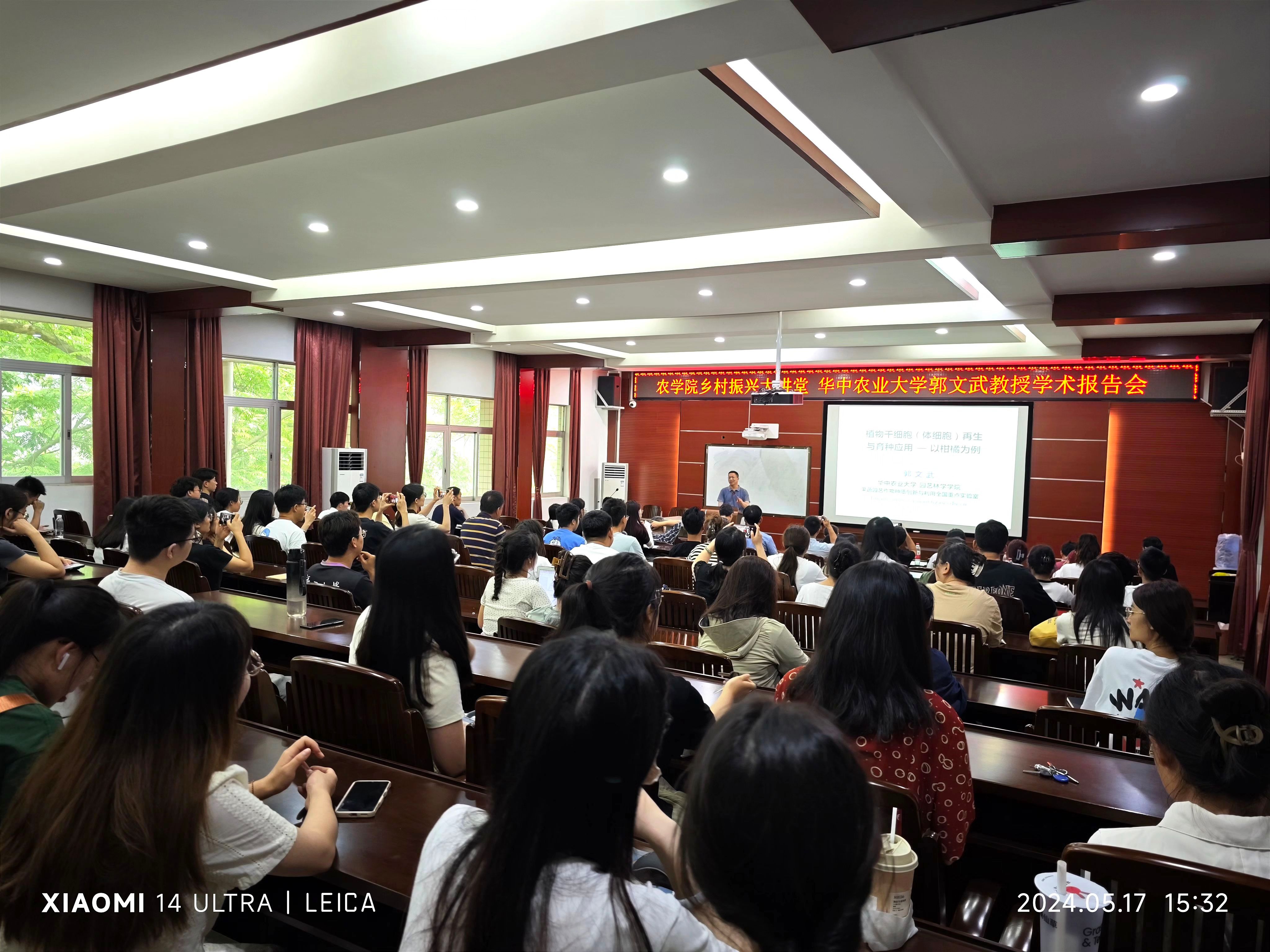 5月17日,国家杰出青年科学基金获得者、华中农业大学郭文武教授应邀到校交流学术,为师生们作了一场“植物干细胞(体细胞)再生与育种应用—以柑橘为例”的专题报告,报告会由李建雄经理主持。