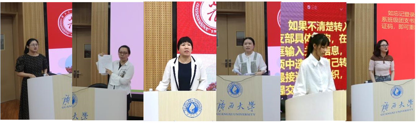 随后,团委副书记李秋实老师对就业、毕业离校等相关工作进行说明,并鼓励毕业生积极就业。宁云芬、段真珍两位老师分别就本科、研究生毕业论文存在的问题进行了讲解。针对研究生档案,段真珍老师根据注意事项进行了重点讲解。李诗老师向同学们介绍了助学贷款的申请和还款的相关事宜,提醒同学们要按时还清贷款。研究生党团建设部的赵菡同学和员工会组织部赵秋婷同学对团组织转接问题进行了演示和说明。
