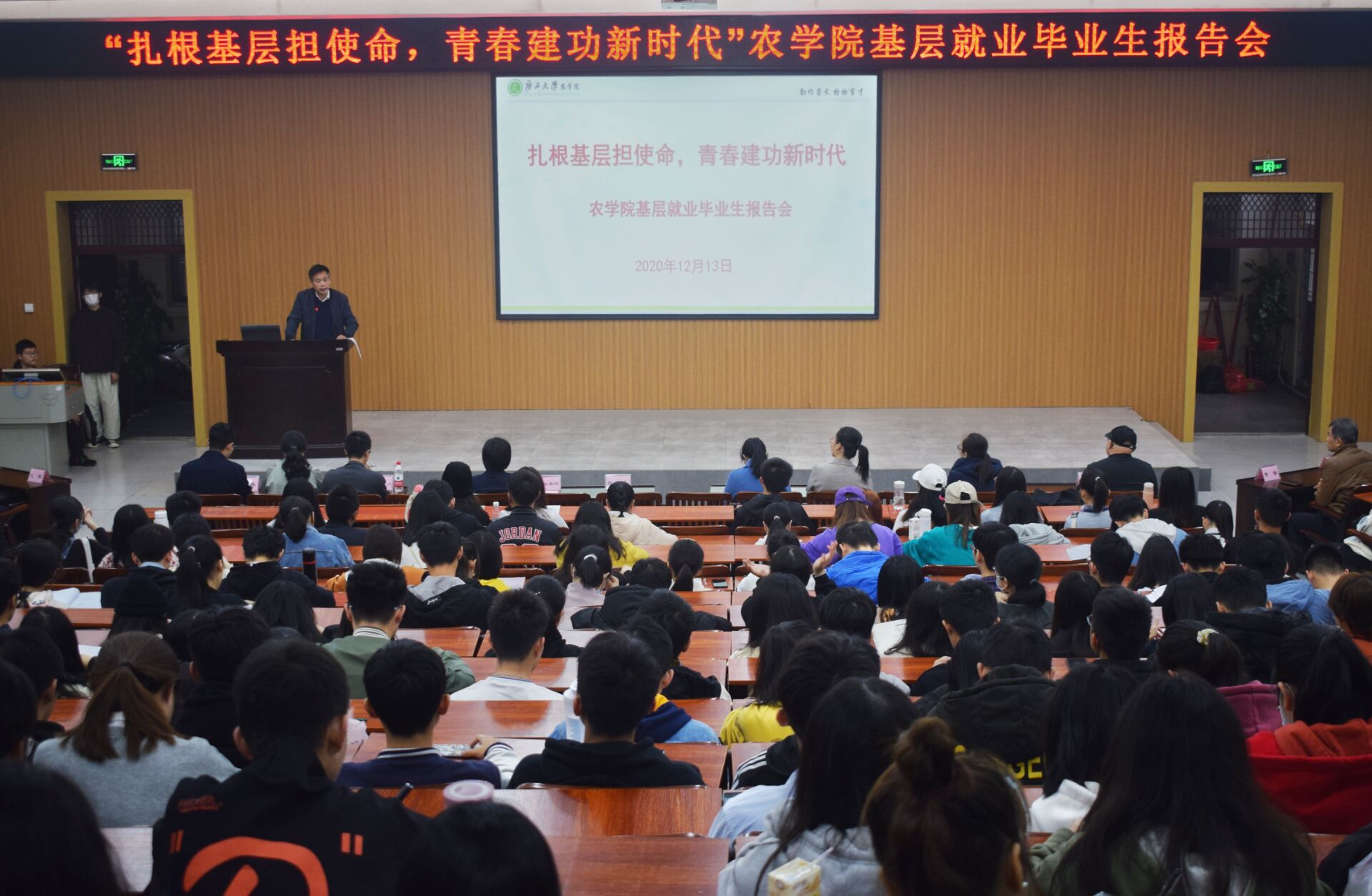 报告会上,农学专业2018届本科毕业生王伦玮结合自己的亲身经历,从精准扶贫过程中的小事讲起,带我们感受基层工作中的三农情怀。农业资源与环境专业2016届本科毕业生韦敬虹乙分享了自己毕业后的成长感悟,并解答了毕业生关注的如何做就业选择等实际问题。土壤学专业2018届研究生毕业生王超然从思想转变、心态转变和角色转变三个方面详细介绍自己两年来扎根基层的心路历程。植物学专业2016届研究生毕业生白小雨用工作中的趣闻趣事生动为师弟师妹们讲述“机会永远属于最主动的人”。农村与区域发展专业2014届研究生毕业生谢杨苏广则从基层的工作状态进行切入,告诉同学们要学会把握细节、肯钻研,常怀感恩之心面对生活,并鼓励同学们扎根一线、勇担重任。