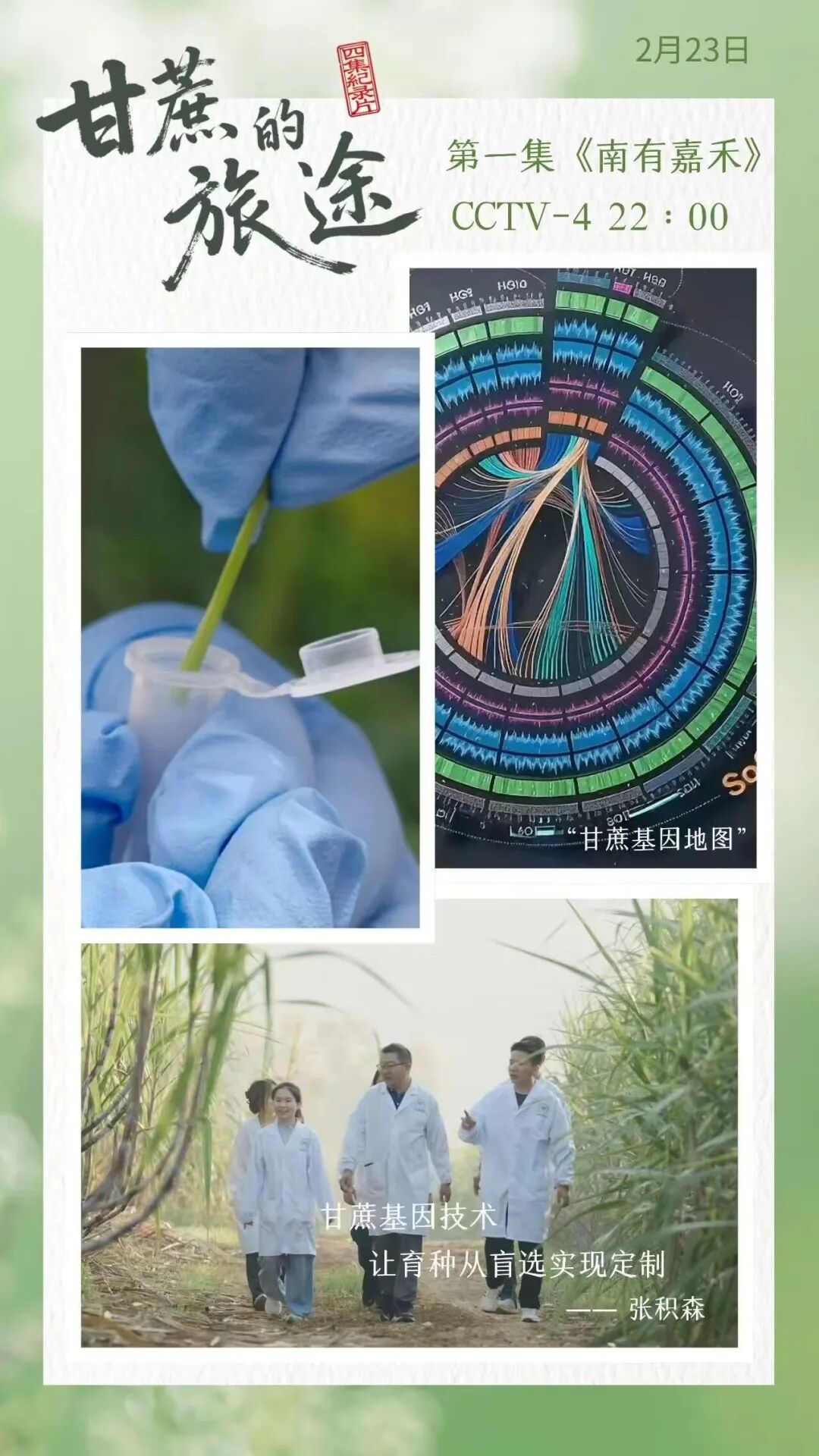节目中,公司师生代表出镜第一集《南有嘉禾》,讲述作为甘蔗育种与基础科研工作者,在这份甜蜜事业背后潜心研究、默默坚守的科研故事。