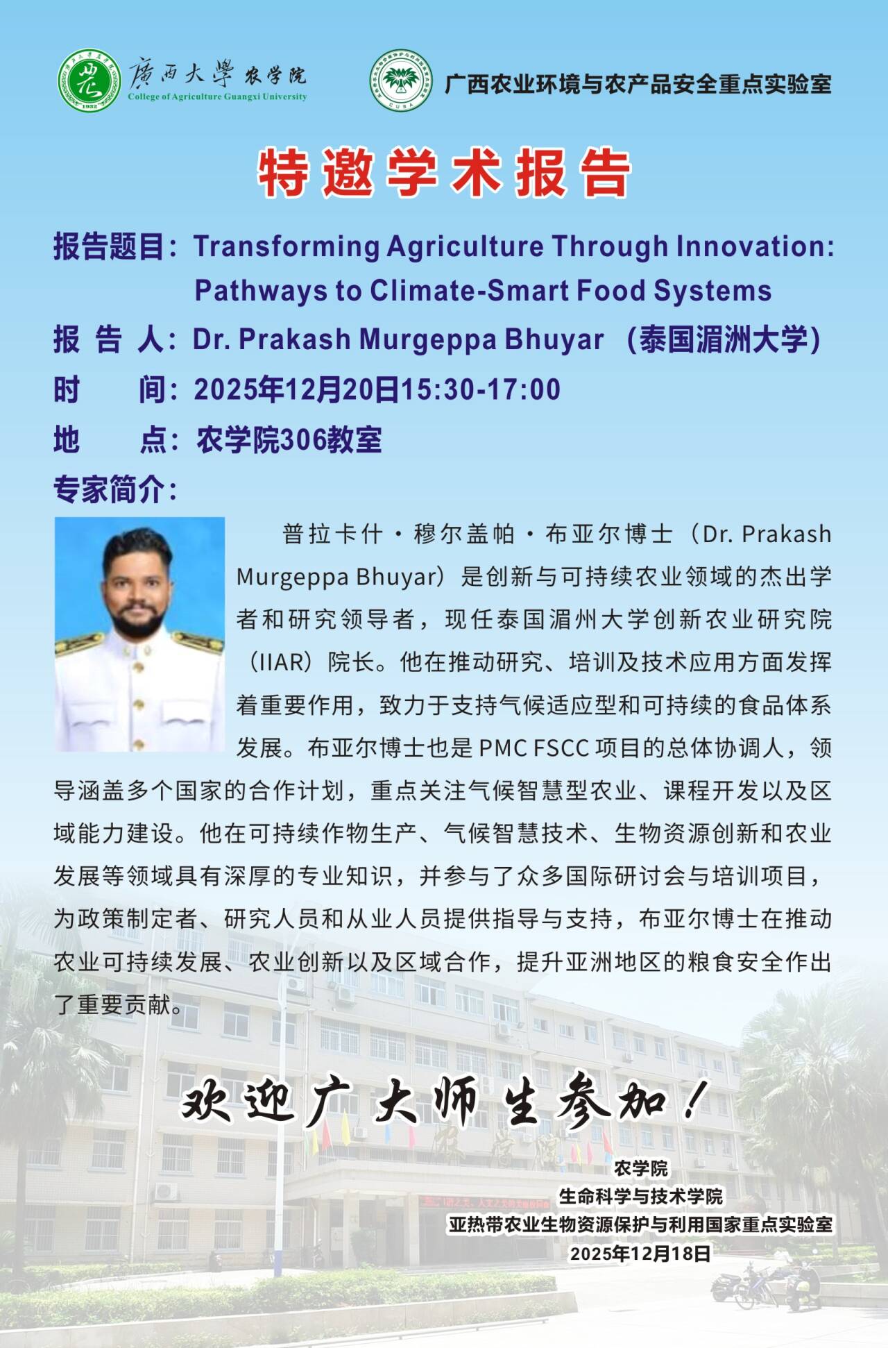 特邀学术报告-报告题目:Transforming Agriculture Through Innovation:Pathways to Climate-Smart Food Systems