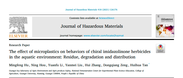 广西农业环境与农产品安全重点实验室/永利yl23411农药残留与环境安全研究团队2021年5月在国际知名期刊Journal of Hazardous Materials上在线发表了题为“The effect of microplastics on behaviors of chiral imidazolinone herbicides in the aquatic environment: Residue, degradation and distribution”研究论文。微塑料是一类粒径小于5毫米的塑料碎片或颗粒,广泛存在于水体和陆地环境中。咪唑啉酮类除草剂因在环境中持久性长的特点,容易污染水体和土壤。近年来,微塑料与环境污染物相互作用的行为备受关注。然而,关于微塑料对该类除草剂的环境行为影响和机制还不清楚。在本研究中,通过建立水-沉积物微宇宙系统的方法在对映水平研究了聚乙烯微塑料对三种咪唑啉酮类除草剂在水生系统中环境行为的影响。结果表明,微塑料能够通过吸附和解吸附的方式显著影响该类除草剂在水生环境中迁移、降解和分配行为,明确了微塑料是影响咪唑啉酮类除草剂在水生环境中行为归趋的重要因素。研究结果为更加全面的评价咪唑啉酮类除草剂的环境风险提供了一定的科学依据。永利yl23411博士研究生胡明锋为该论文的第一作者,谭辉华教授为通讯作者。该研究得到了国家自然科学基金项目支持。原文链接https://doi.org/10.1016/j.jhazmat.2021.126176