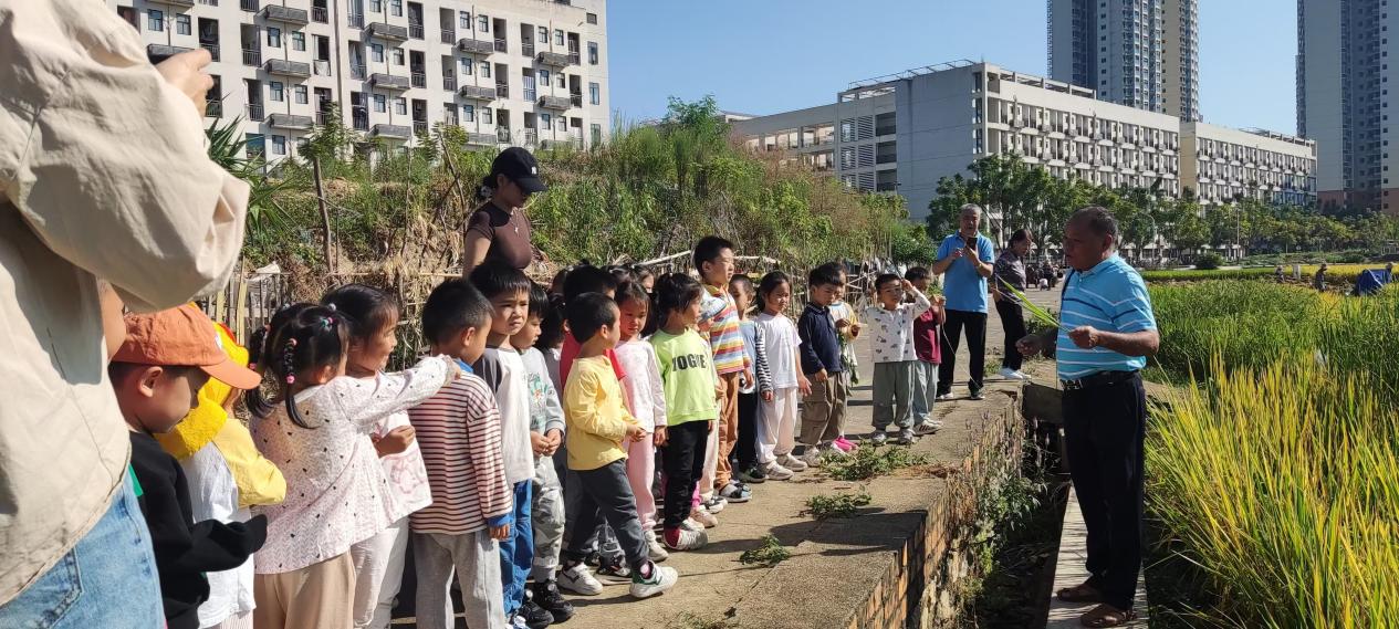 10月31日,永利yl第一幼儿园中班3个班级的师生约120人,到实验中心水稻教学科研基地进行科普教育活动。中心杨培忠老师对前来参观的老师和小朋友进行科普分享。杨老师采用通俗易懂的语言分别从水稻栽培史,水稻新品种选育,水稻种植技术和水稻育种科学家等多方面进行讲解,让师生们初步认识了水稻基础知识,了解我们吃的米饭是怎样种植出来的;并鼓励小朋友长大后要当育种科学家,让他们认识到水稻种植的艰辛过程,引导他们不要浪费粮食。此外,本次活动还对小朋友们的疑问进行解答,现场参观了不同水稻品种的性状和水稻采收过程。中心伍朝荣博士陪同讲解。
