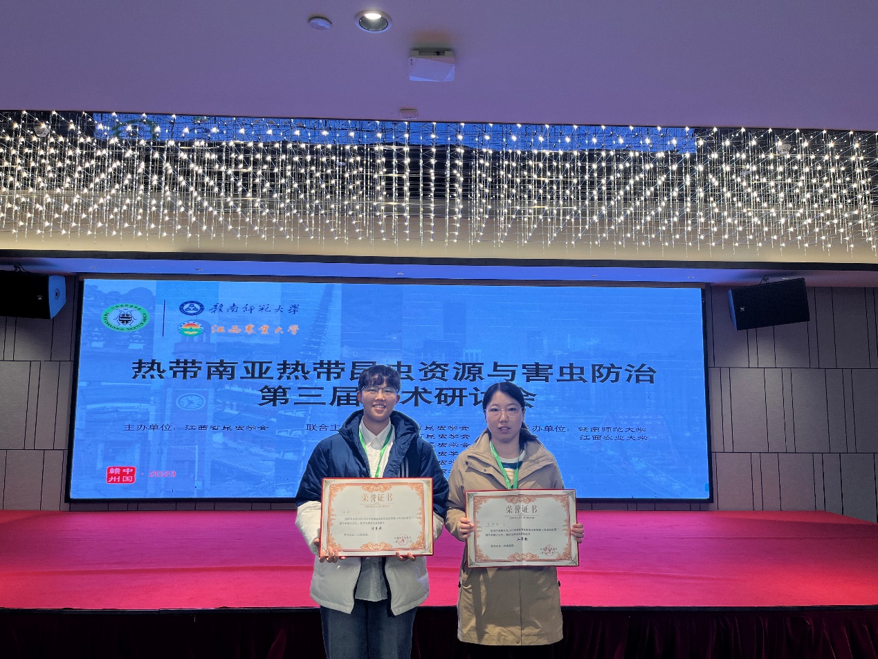 2023年12月3日-6日,热带南亚热带昆虫资源与害虫防治第三届学术研讨会在江西省赣州市召开,永利yl23411博士研究生胡锦和苏冉冉参加了会议,并分别做了学术报告。