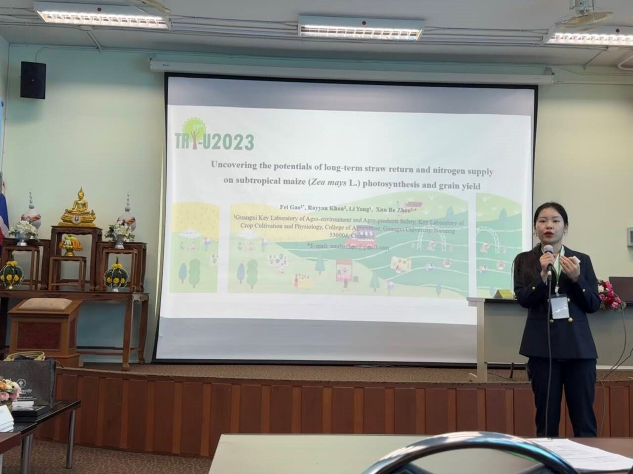 2023年12月21日-23日,公司作物学硕士研究生高菲参加在泰国梅州大学举行的第29届中日泰三方员工论坛。本次会议汇聚了来自中国、日本、泰国、斯里兰卡、印度尼西亚等国家的多所高校师生,围绕人口、粮食能源、环境和农业创新等主题进行了深入交流讨论,并在主办安排下参观校园和实地考察活动。